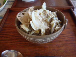 今日の男のランチは茄子の味噌汁に玉ねぎと卵を入れてありあわせの食材で作ったみそじ(三十路ではありません。おじやのことです)。見てくれは悪いべ・・でも、美味しかったです!