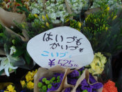モデルの菜の花を探しに山形駅前通の花店パークサイド・フローレストに行ってきました。店先に面白いPOPがありました。どれもこれも525円という山形語なのですが、「はいづも、かいづも、こいづもって、どの花ですか?」と、聞かれることがあるとのこと。