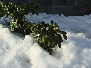 ユキツバキは、細くしなやかに幹が株立ちします。雪が降ると、雪にすっぽりと埋まることで寒さから身を守るのだそうです。