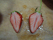 A友人のE子さんが、二つに切ったイチゴを地面に置いていたら、芽が出てきたのだそうです。それをポットに移植したのを写させていただきました。イチゴの表面にあるつぶつぶ種から芽がでるなんて・・・