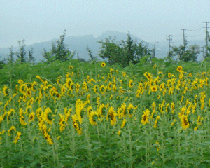 ヒマワリは、太陽を追いかけて花の向きを変えることから漢字で向日葵と書く、ということを聞いていたのですが・・・工房の交差点から東へ二つ目の信号のある交差点の東南角で地区の方々が植栽しているヒマワリ畑のヒマワリは、ほとんどが東の方を向いたままで一日を過ごしています。(この写真は夕方写しました)