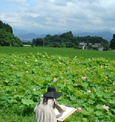 富神山の南麓に、地区の方々が管理している古代ハス畑ができました。いまが丁度花盛りです!高校生がスケッチをしていました。僕も谷柏のハス畑で描かせていただいていますが、天気が良いので、紙の白さがまつぽくて(まぶしくて)大変です。それに、腕や、頭皮まで日に焼けてしまいました。