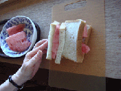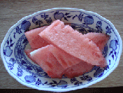 期間中、絵の仲間のO田さんから「ベニ枕」というスイカの差し入れがありました。文子さんが早速シベールの玄米パンを買ってきました。ちょうど自転車で来館されたA田さん夫妻にスイカサンドをご馳走しました。もちろん大好評!!!