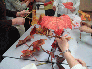 今日のNHKカルチャー仙台教室は、ブドウのスチューベンでした。上山市皆沢のK果樹園さんから、Kさん自慢の甘くて美味しいスチューベンを譲っていただいたのですが、スチューベンの葉があまりにも美しく紅葉していたので、葉っぱもいただいてきました。