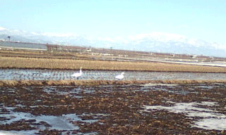 写真は12日、北帰行の途中に山形市黄金地内の田んぼに立ち寄った白鳥です。バックの山は葉山です。僕の車が近寄っても全然怖がるそぶりを見せないカップルでした。画面には写っていませんが、左手奥に100羽ぐらいの群れが餌を啄ばんでいました。