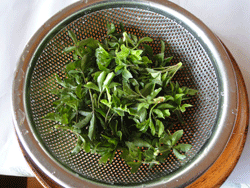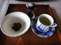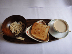 秘密の県民ショーで「山形県人は垣根を食べる」という番組でウコギの新芽が紹介されたことがありました。絵の仲間のMiyakoさんに苗木をいただいて植えた工房駐車場のウコギの新芽が食べごろになったので、摘んできて(写真左)茹でたらこんなに少なくなりました。茹で汁がどんな味がするか、スープ代わりに飲んでみようと思いました(写真中央)。納豆の解凍が間に合わなかったので、生うどんに、これまた絵の仲間のYumikoさんにいただいたガーリック入りのオリーブオイルと醤油をかけ、うどん1袋で足りない分は、食パンに醤油をまぶしてトースターで焼いてみました。 これが今日の僕の朝食でした。