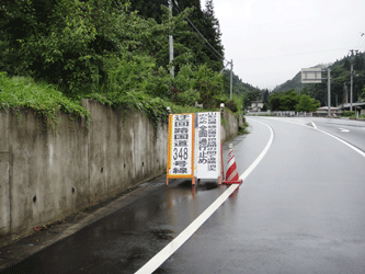 工房は県道17号線と村山西部広域農道山辺・上山線の交差点南西角に建っています。この交差点から白鷹町荒砥まで約40キロ、信号のある交差点がありません。県道17号線は、このたびの豪雨で畑谷と摂待の間の道路が流失し全面通行止めになっています。この看板の左上の部分が工房の駐車場です。