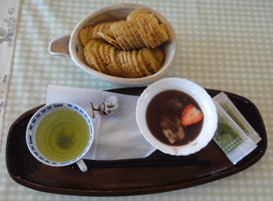 お汁粉と干し柿とお菓子、それにイブリガッコが緑茶に合いました。