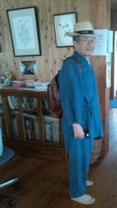 出かけるときはリュックを背負っています。今日は暑いので麦わら帽子をかぶりました。