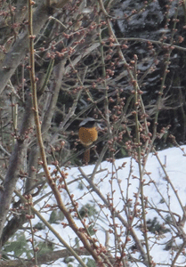 見れば、窓から4〜5メートル位の梅の枝にお腹がオレンジ色の美しい小鳥。20分ぐらいのあいだ、あっち向いたりこっち向いたり。ヒタキの仲間と思い、急いで野鳥図鑑で調べる。